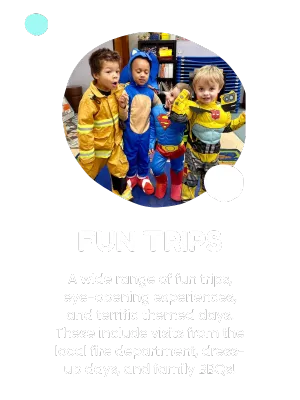 A wide range of fun trips, eye-opening experiences, and terrific themed days. These include visits from the local fire department, dress-up days, and family BBQs!